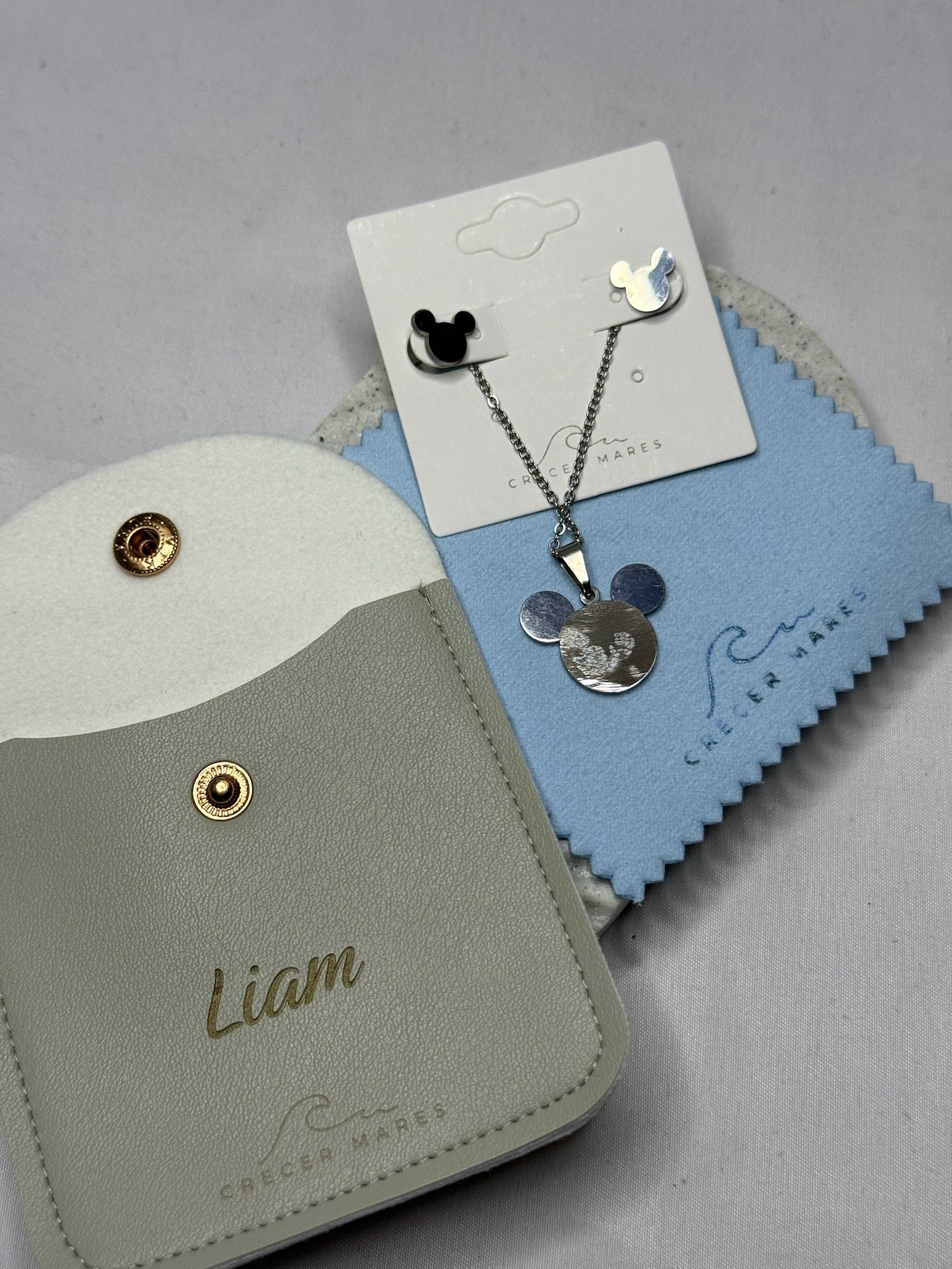 Dale un toque especial a tu estilo con este encantador conjunto inspirado en Mickey. Fabricado en acero inoxidable hipoalergénico, resistente al agua y al paso del tiempo, este set incluye: